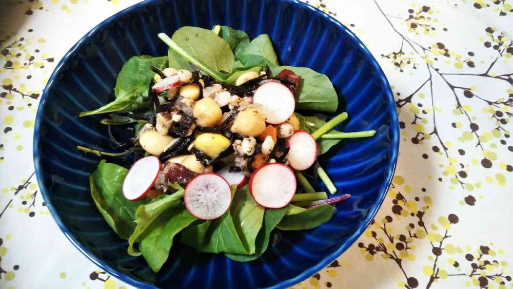 青いお皿でしたので、二十日大根の赤やサラダほうれん草の緑が映えますね🙂
