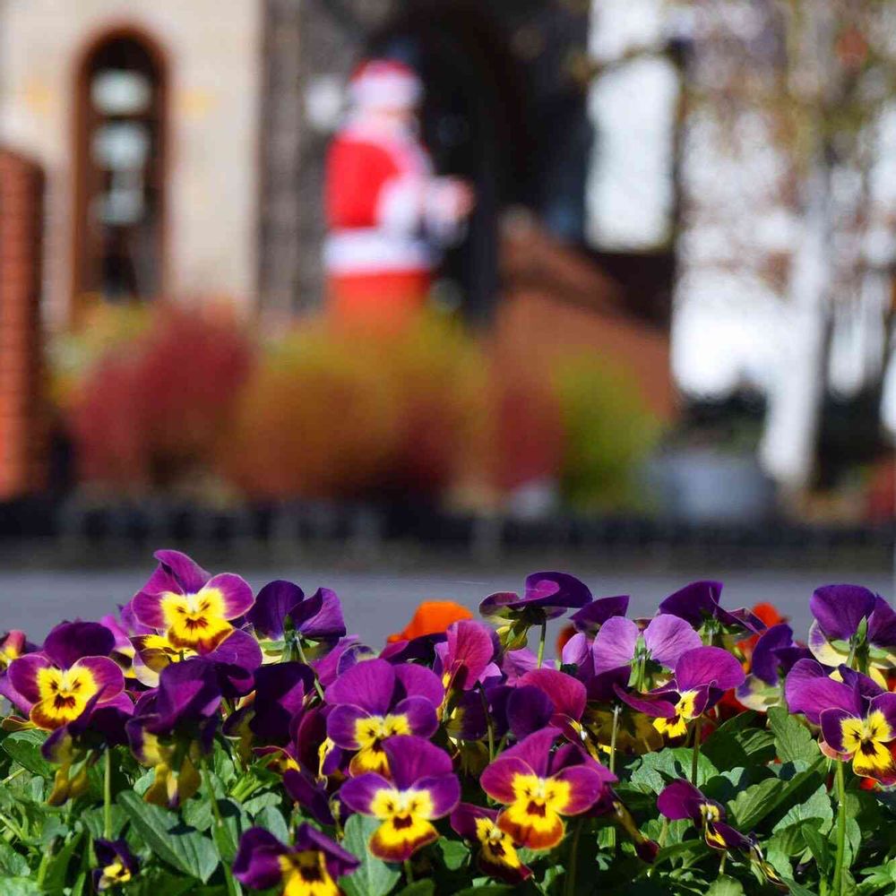 【研究学園の花々】2020年11月14日、ケンタッキーフライドチキン前の歩道花壇の植替えを行い、ノースポール、ビオラ、ハボタンを植えました。カーネルおじさんは早くもクリスマスの装いでした!