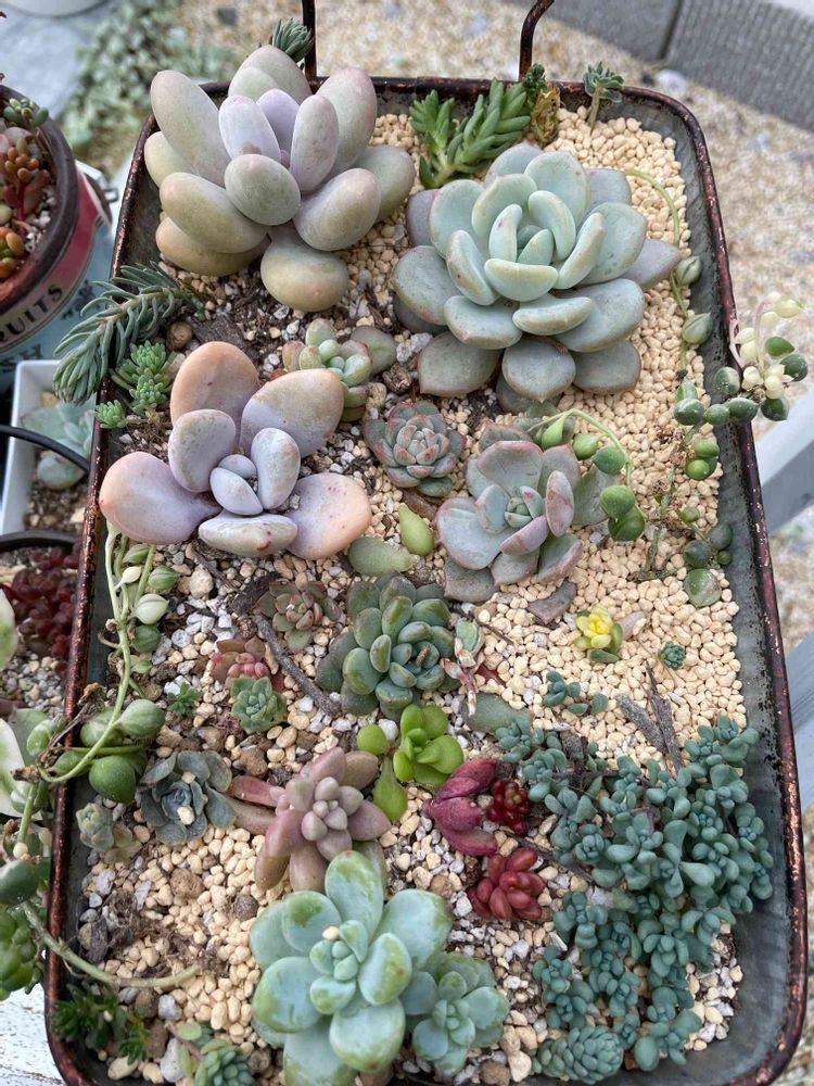 お得意のスッカスカで、抜いたり挿したり入れ替えたりして落ち着かない寄せ植え。早くモリモリにならんかなぁ。