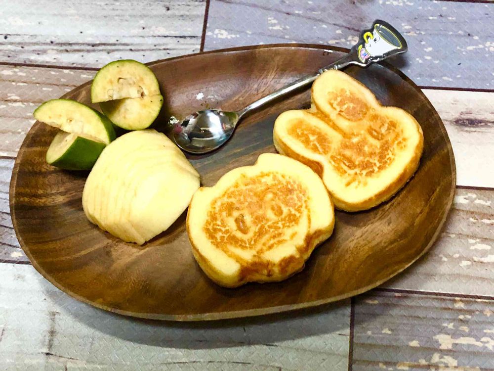 パンケーキの材料はホットケーキミックスに卵と豆腐で溶いて少し水を入れて型にいれてトースターで10分