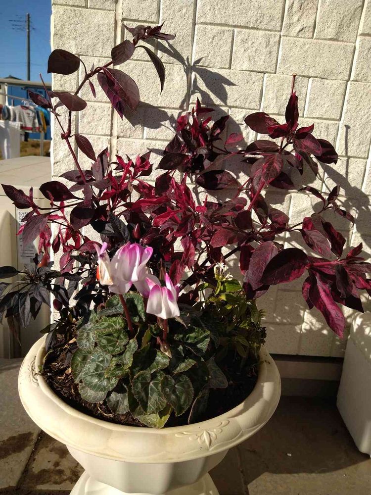 ハロウィン用に植えた寄植え。ケイトウが終わったので、代わりにミニシクラメンを植えて冬使用の寄植えになるかな?とチャレンジ。