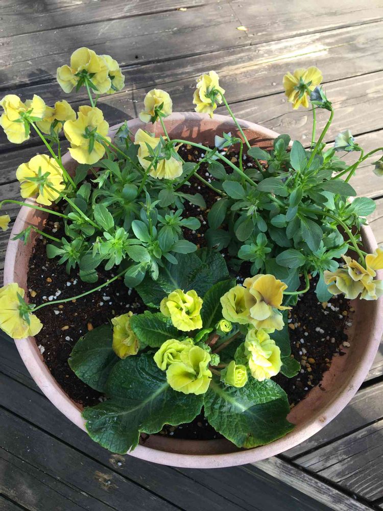 黄色の花でまとめました。黄色のプリムラってふんわり香りがあるので大好きです。このプリムラは少しグリーンがかって、好みの色合いです。花びらも厚めなバラ咲でそこもイイ!