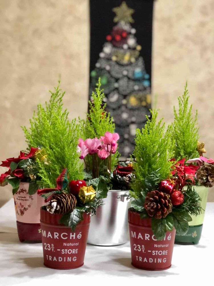 気づけば11月も下旬、少しずつクリスマス仕様にしてきたものの、今年の新しい仲間にスーパー店頭のミニコニファーを見てヒラメキ💡100均へ行って、ブリキのバケツと小さなポインセチアを買って作りました。