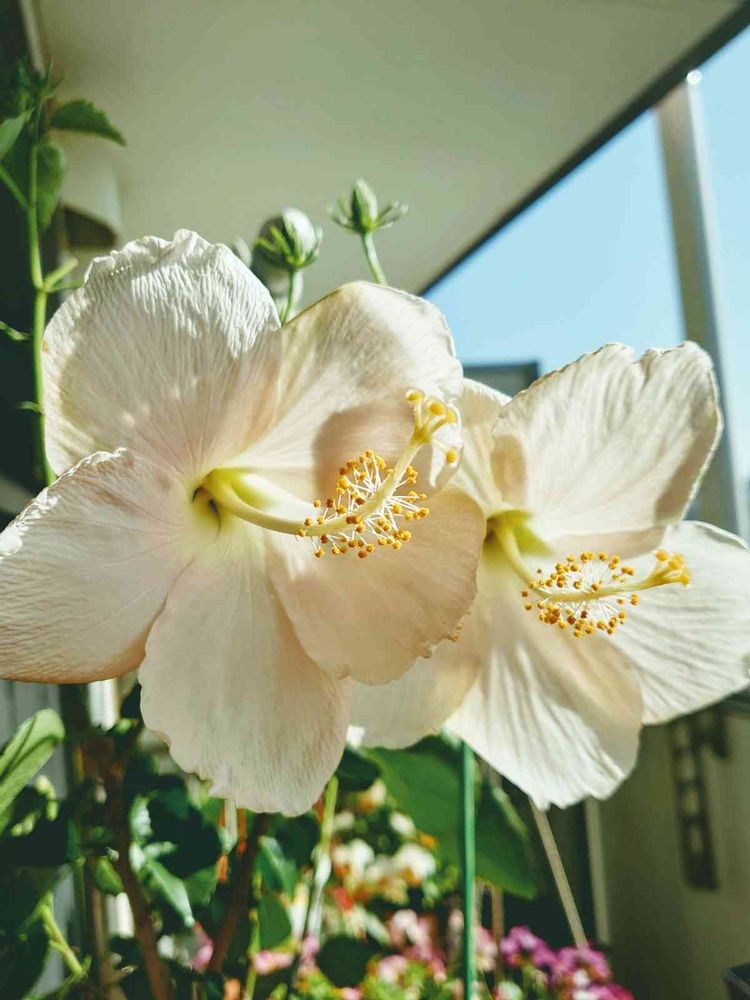 にゃん吉ちゃんの白のハイビスカス🌺オソロでランデブーってしようかと思ったけど白が咲いてくれてなくて💦