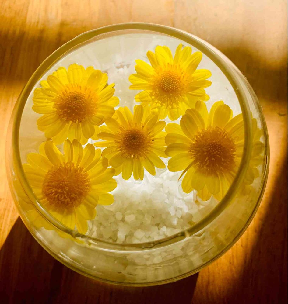 茎が短く花瓶にさせないのでガラスのお皿に白いじゃりを入れて浮かべてみました。