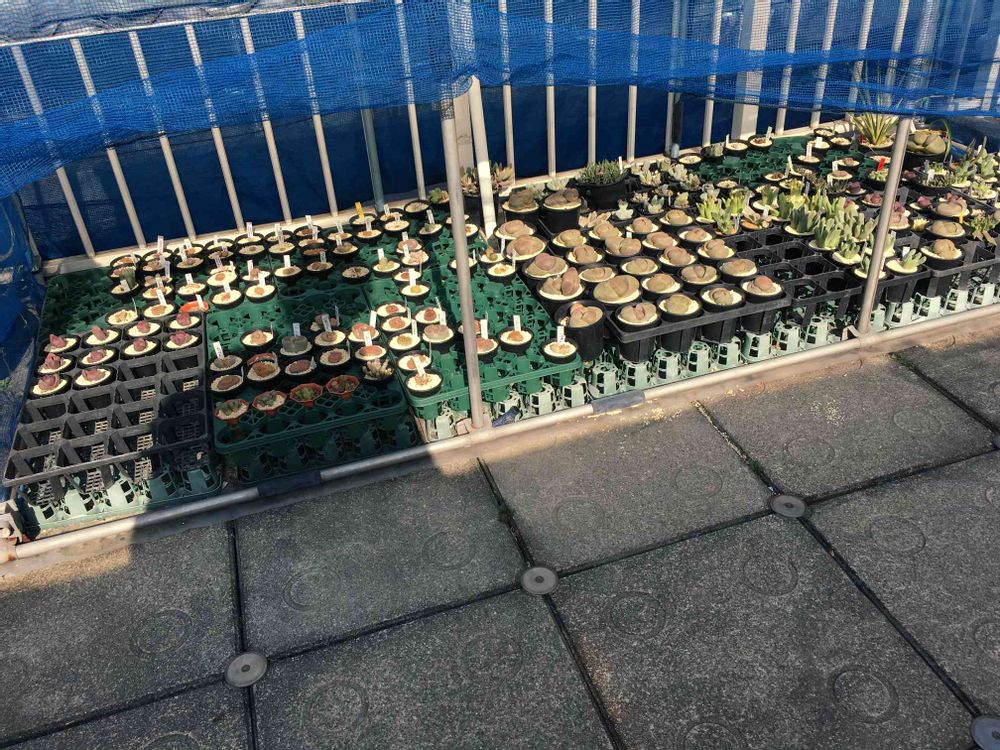 西武百貨店の屋上でショップを出している鶴仙園の本店に行きました。駒込にあります。駒込駅より10〜15分程で本店に到着。駒込は坂が多く、古い住宅街になるのでキョロキョロと家々を見ながら行きました。思いこみがあって、このような道幅も狭い住宅街で、どんな大きな温室があるかと探していましたが、マンションの一室の作業場と3階にある温室でした。ちょっと拍子抜けでしたが、栽培しつつ販売もそして、お話と。忘れられない体験となりましたね(*^^*)。3階の温室は、サボテンがびっしりでした。温室前のメセン(帝玉など)が並んでいます。