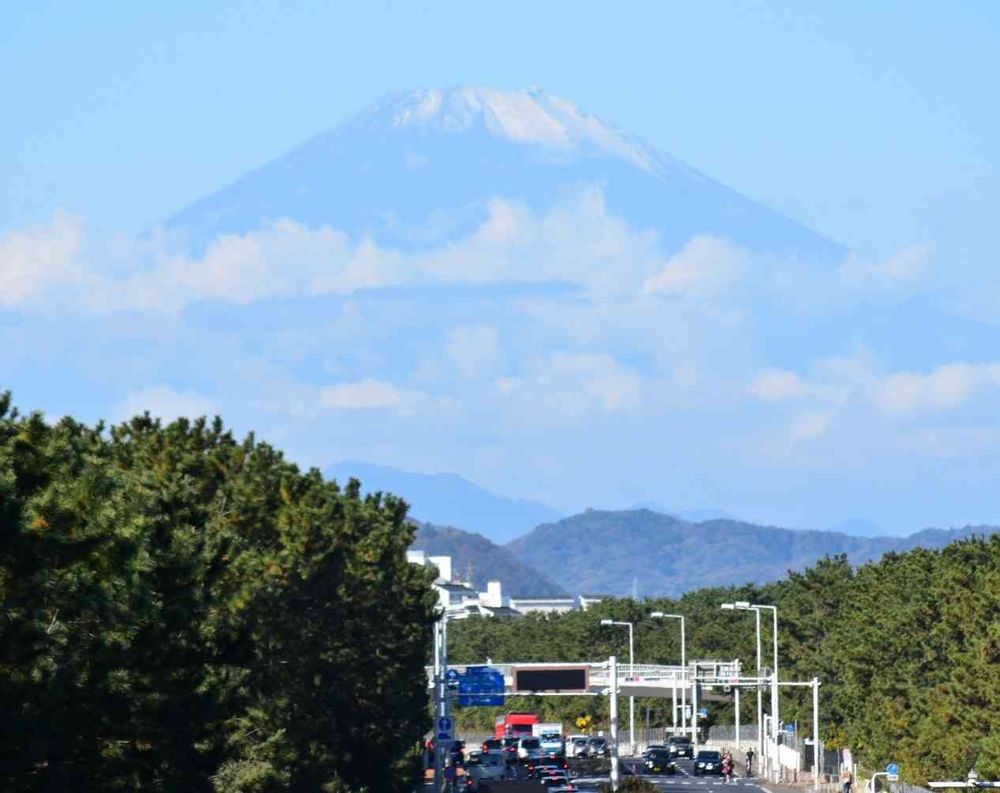 海に渡る歩道橋の上から見えるR134と富士山🗻、すぐ左が海です🏄♀