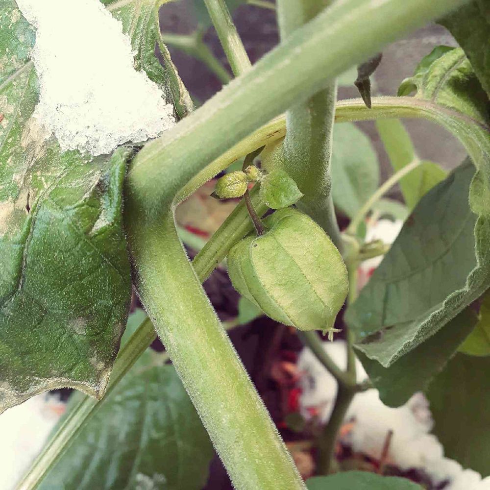 熟せなかった食用ホオズキに雪