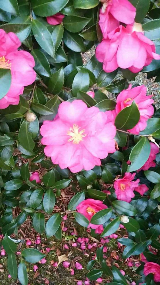 サザンカの花、咲き溢れそして散りも行く。下に落ちてる花びらも増えてる