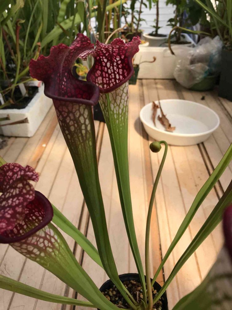 今年の4月に京都オフ会で購入したサラセニア ミッチェリアナ×レウコフィラと思われるものに花芽が上がって来ました。秋に花芽が付いたことはありますが、夏場は初です。余計なエネルギーを使わせたく無いので除去しました。