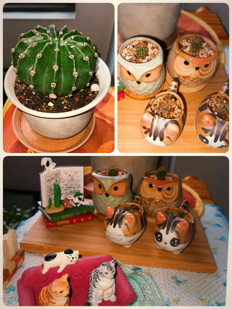 赤ちゃん🌵ちゃもカワイイけど植木鉢のフクロウさんと🐱ちゃんもカワイイ💕