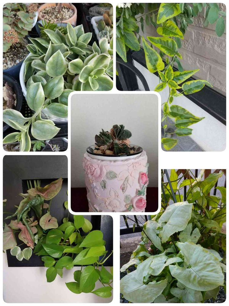 右上から時計まわりに、ヤマホロシ、シンゴニウム、ペペロミアとシンゴニウムネオン、ベビーさんろーず、そして中央が、ガステリア。これ、先月からあまり変化ないです。お亡くなりになってませんよネ⁉️