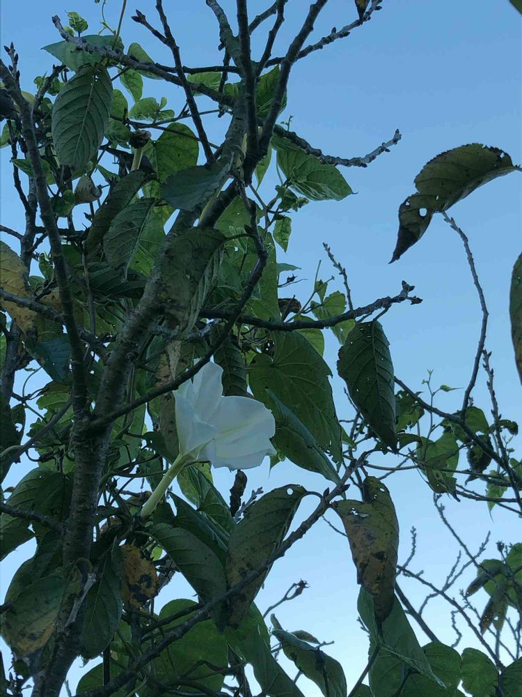 桜の木に咲く夕顔の花。朝だから、少ししぼんできてるけど😅