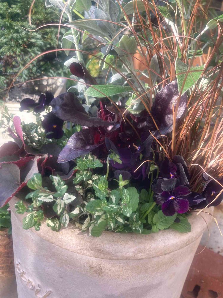 黒のサルビア、ビーツ、ビオラ、ヒューケラと黒が多めの寄せ植え…あれ?シルバーのディコンドラがない😱一番に入れたかったのに😭