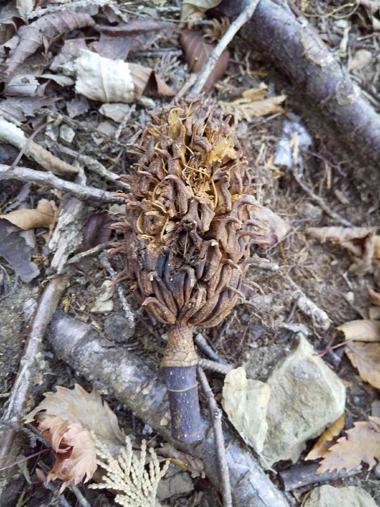 お山のハイキングで、大きな木の実が落ちていました。 ホオノキの実 だそうです。 この子の 大きな葉は よく見掛けますが、実 は 初めて見ました🎵😄