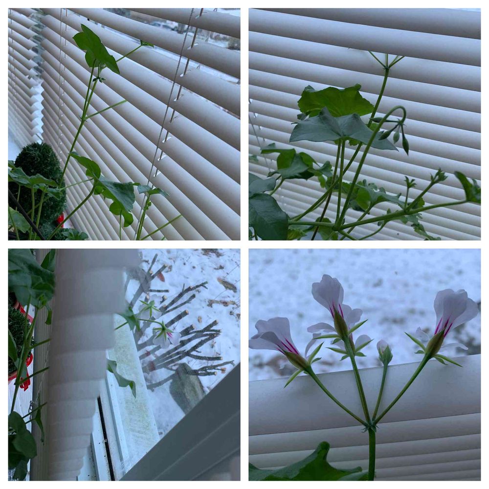 秋に室内に取り込んだアイビーゼラニウム、ブラインドの隙間から伸びて、花を咲かせてます😊💕