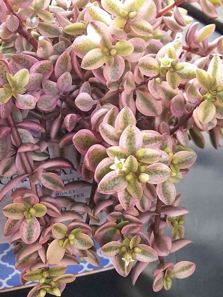 ボルケンシー錦 葉っぱがピンクになってきて、可愛いお花も咲き始めました🌼