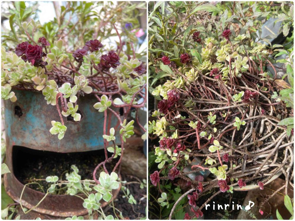 左下のBBQコンロの頭に見えるひょろひょろの子がフクリンマンネングサですっ