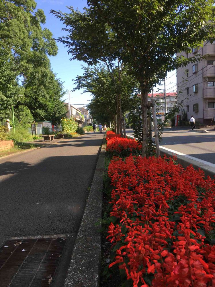 ここは歩道が広いです。車が走れそうです。左が歩道です。赤いサルビアがずーと続きます。