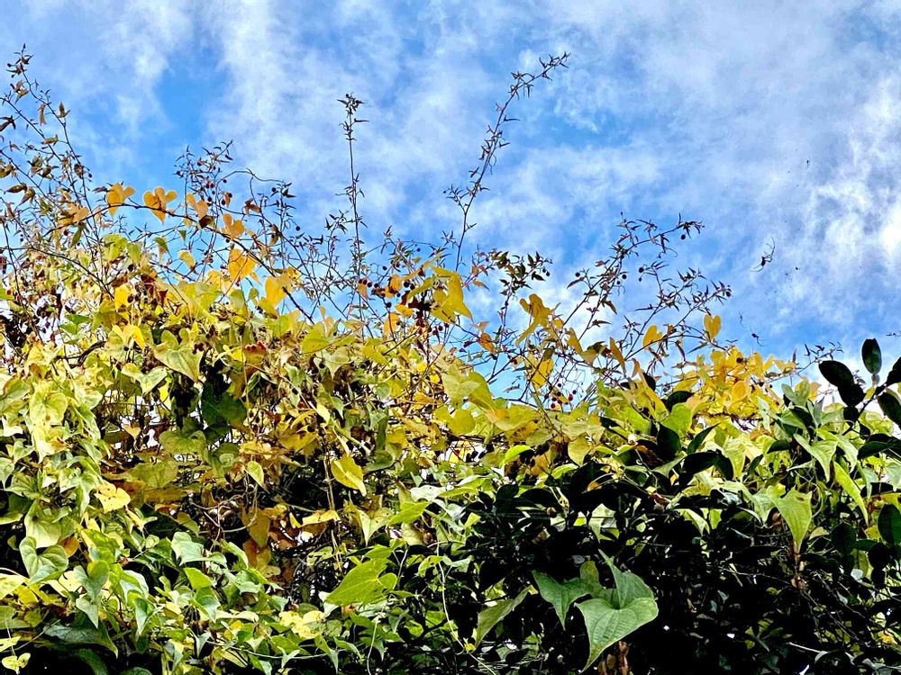 黄葉しているのはオニドコロ、空にピョンピョン突き出ているのはヒヨドリジョウゴ