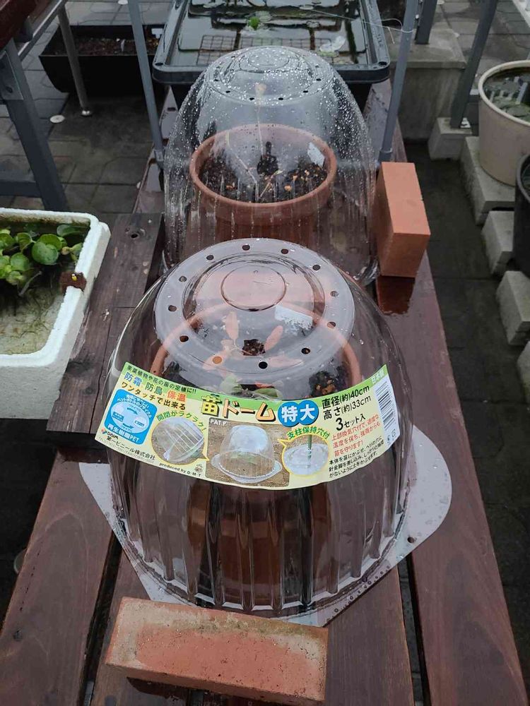 温室効果を期待して、苗ドームに寒がり屋さんを入れてみます。