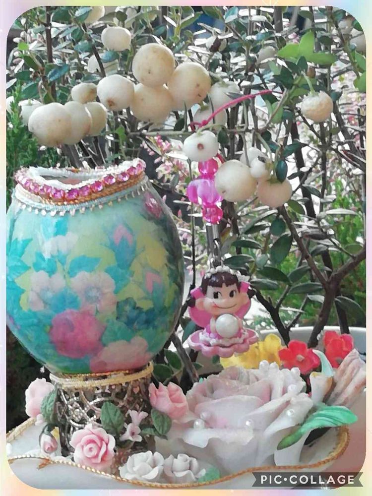 真珠の木🌲の下で真珠を持ったペコちゃんが皆様の健康と幸せを祈ってます✨🍀(💗 •͈ᴗ•͈)🍀✨