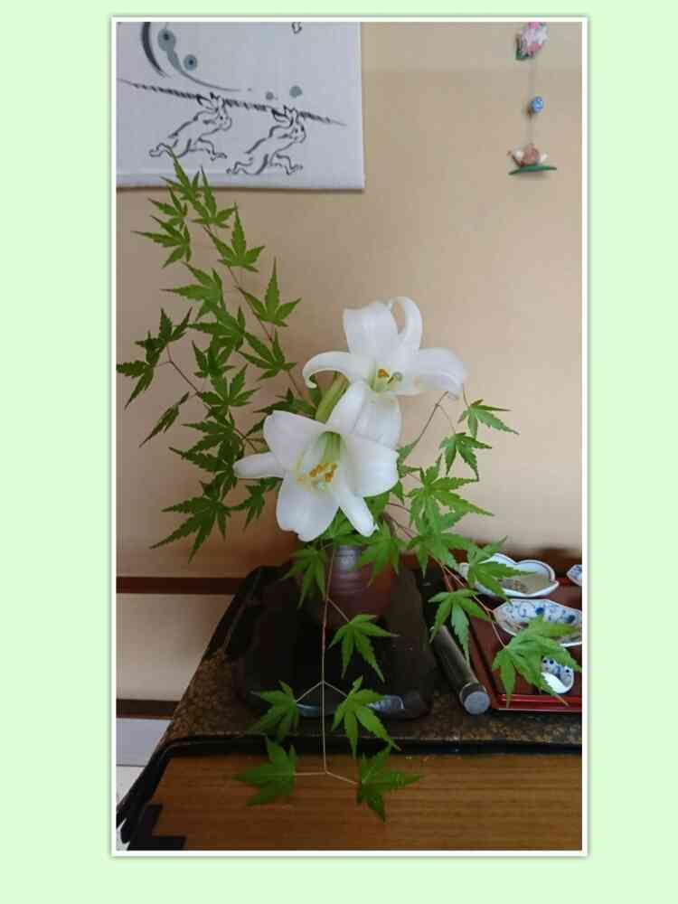 庭にユリが涼しげに咲いてたので青紅葉と活けてみました❗