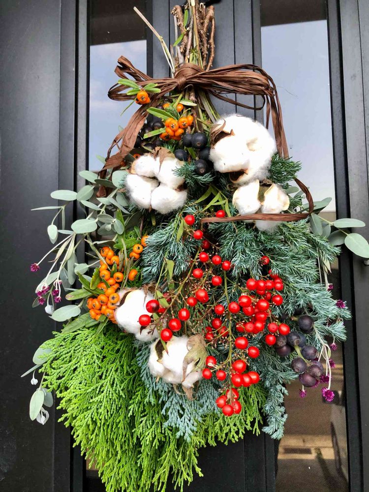 お家で育てた綿花と友人に頂いた針葉樹でスワッグ作り🌲玄関の出入りが楽しくなりました😊