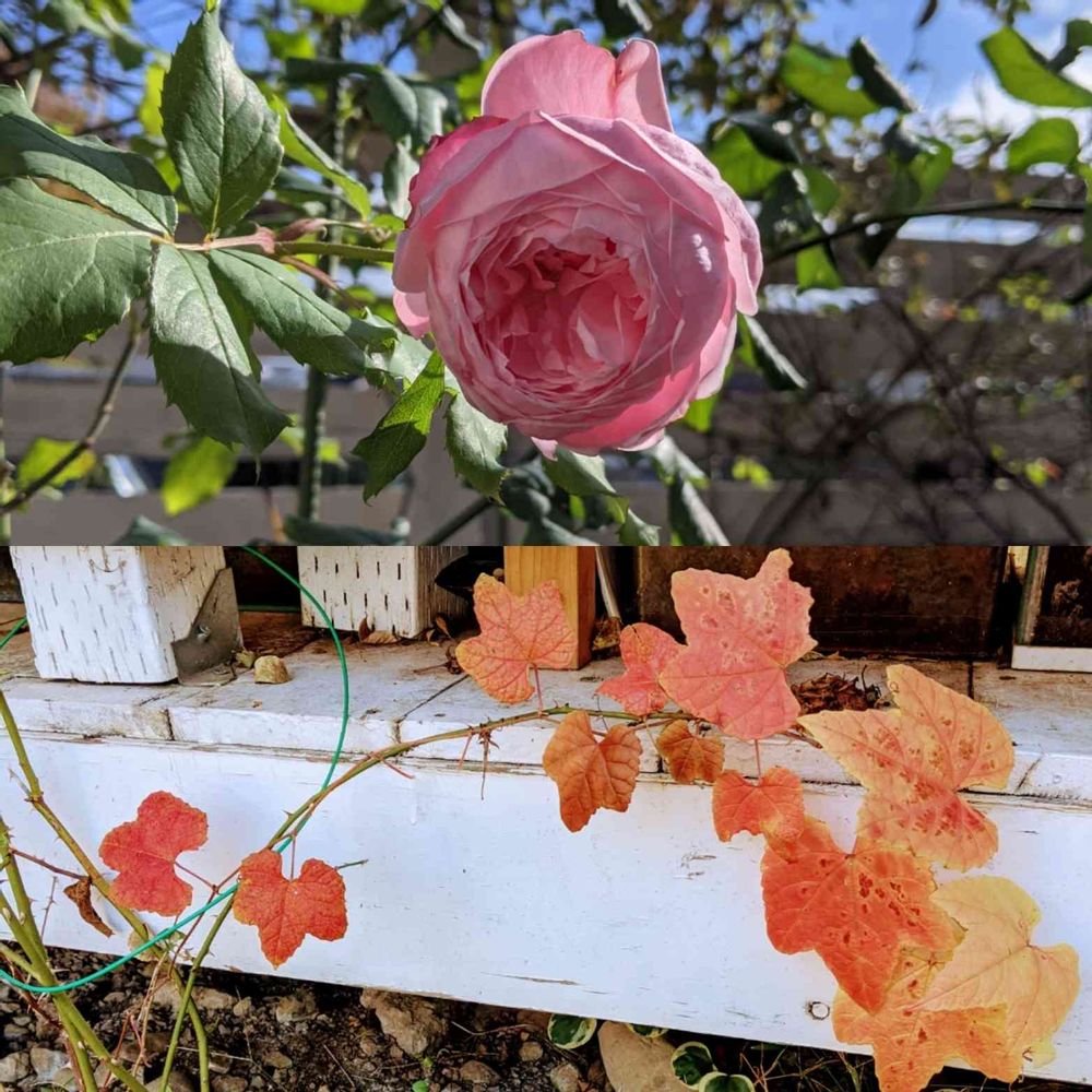 下は野ぶどう🍇何年も前に頂いて地植えしてるけど、周りの草たちに埋もれてなかなか大きくなれないこ😥でも綺麗に紅葉してました✨葉の形もかわいいです😊