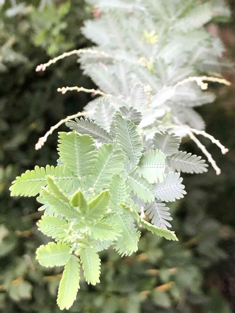 銀葉アカシア(ミモザ)。シルバーリーフと呼ばれる銀色がかったグリーンの葉が特徴的です。3月頃で総状花序に黄色の花をつけるのです🌼