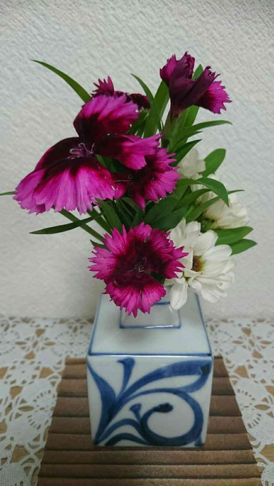 残っていたセキチクを、先日道後温泉で購入した砥部焼きの一輪挿しに生けてみました。