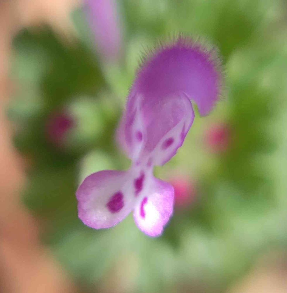 おや、うちの庭にもホトケノザ♪さっそく100均マクロでのぞいてみると、下唇には斑点が、頭(花冠)にはフサフサとした毛が見えました。