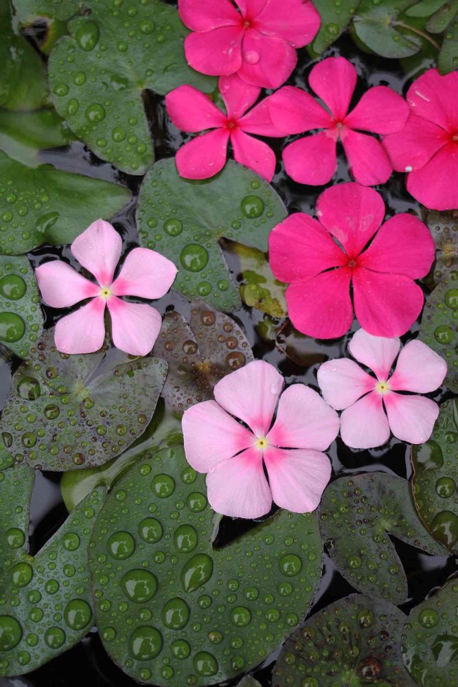 となりで咲く日々草の鉢にふと目をやると、この雨で花びらが数枚下に落ちていたので拾い上げて、ちょっとお邪魔して浮かべてみました。