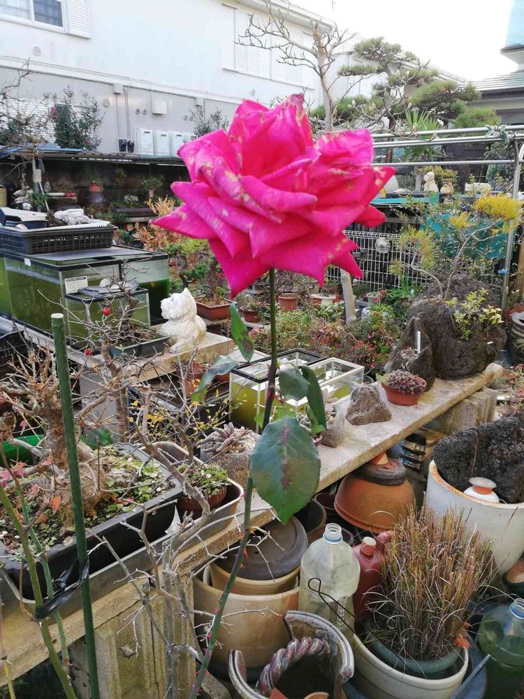 寂れているけど 庭に一輪のバラ 目立ちます🤭