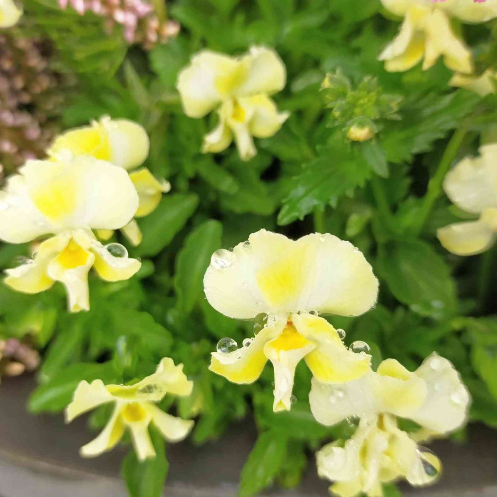 変わった形だけどビオラですよね?ところどころ雨粒をのせていて、かわいいです😊