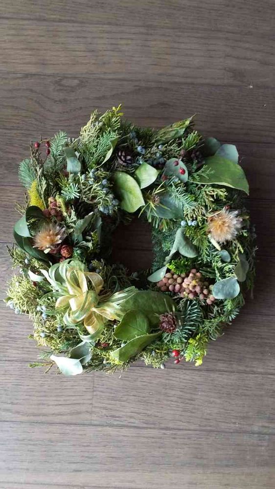 スギ、ヒノキ、ネズ…の他 ユーカリ、レモンリーフ、ルスカスなどのグリーンに 赤いバラの実や諸々具だくさんで~作れました(*^^*)