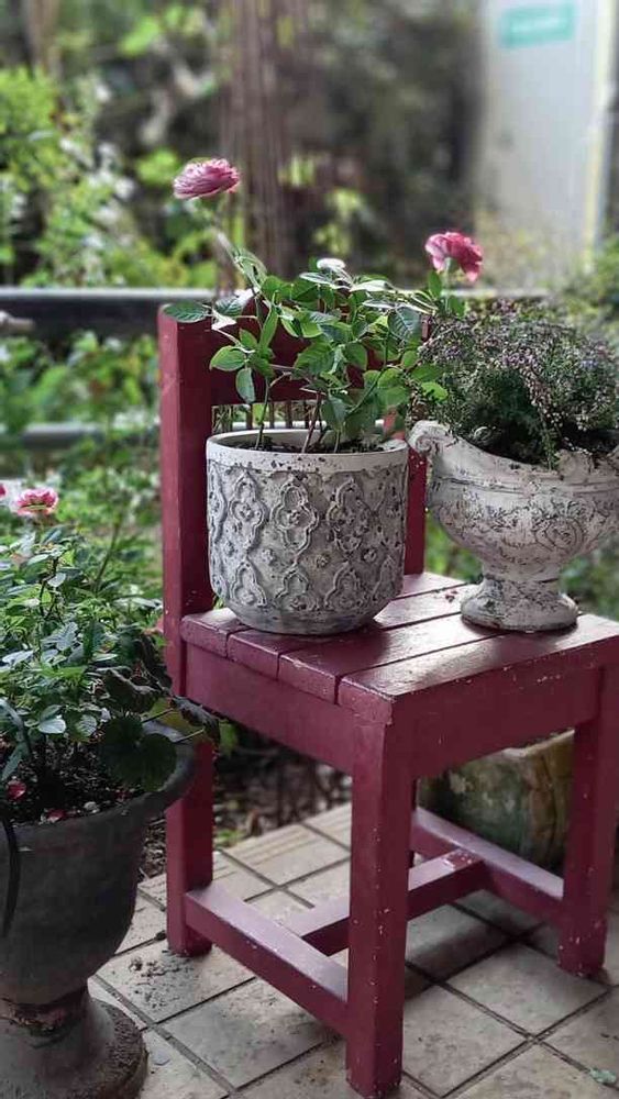 マンション一階専用庭でDIYガーデニングしています。 日当たりのいい南側の庭と半日陰の東側のL字型の庭です。 ペイントの剥がれやアイアンの錆びなど、 シャビーでカッコイイのが好みです。