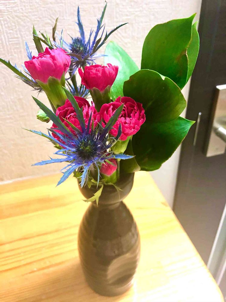 今宵も徳利に活けたお花を眺め、晩酌しております。美しく、バランスよく咲いています♡