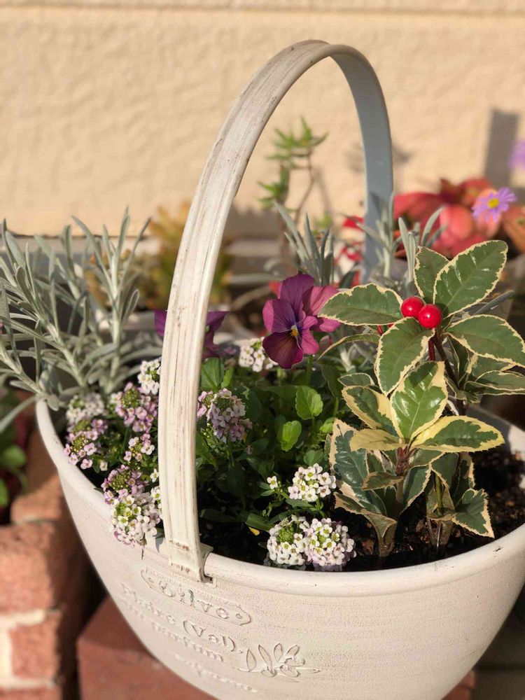 花カゴのイメージで植えてみた。斑入りヤブコウジがクリスマスホーリーのようですが実は人工的につけてありました😅