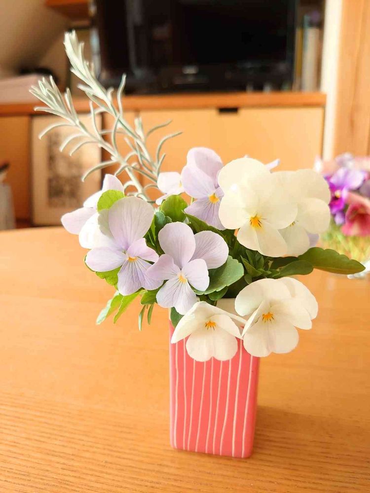 おととい心を鬼👹にしてビオラやパンジーをピンチする話をしましたが、庭から次々摘んで部屋に持ち込む理由ができて楽しくなってきました👹