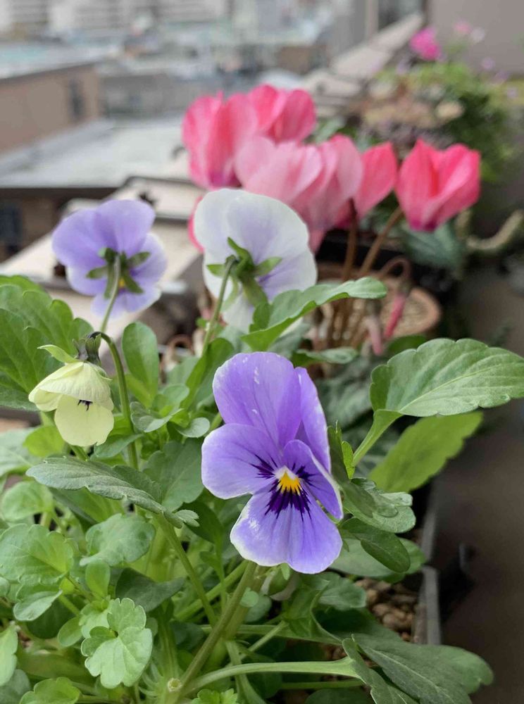 バルコニー/ベランダ,ガーデンシクラメン クレヨン,ビオラ アズールドーンの投稿画像