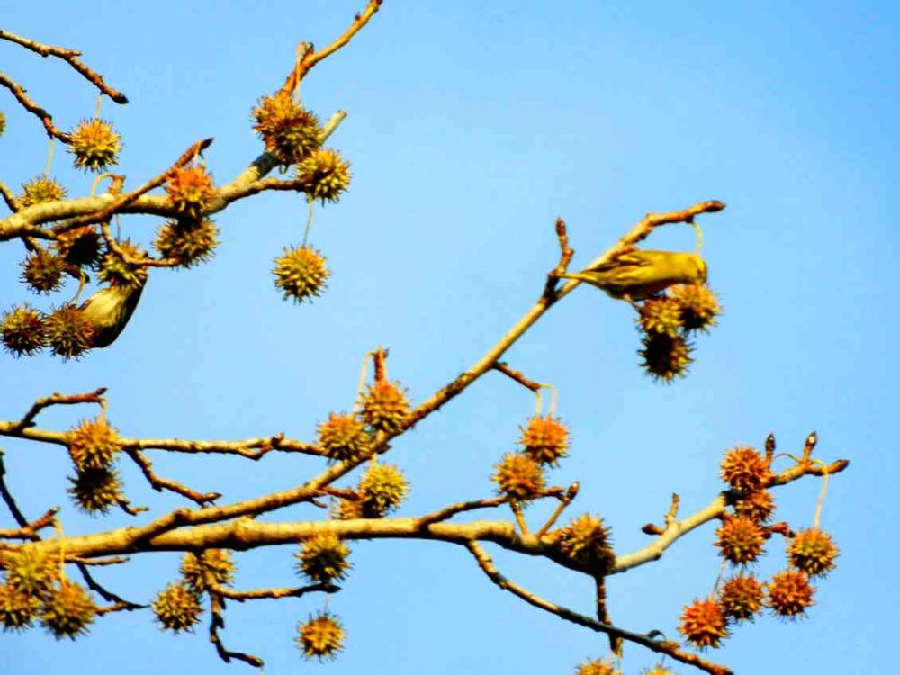 モミジバフウの実を、マヒワが食べてます‼️