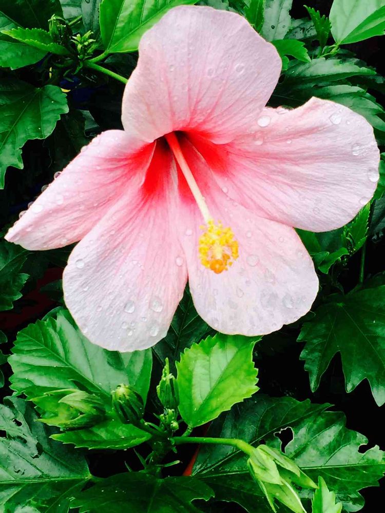 これもご近所の玄関に咲いていた鉢植えのハイビスカス。蕾がたくさん。