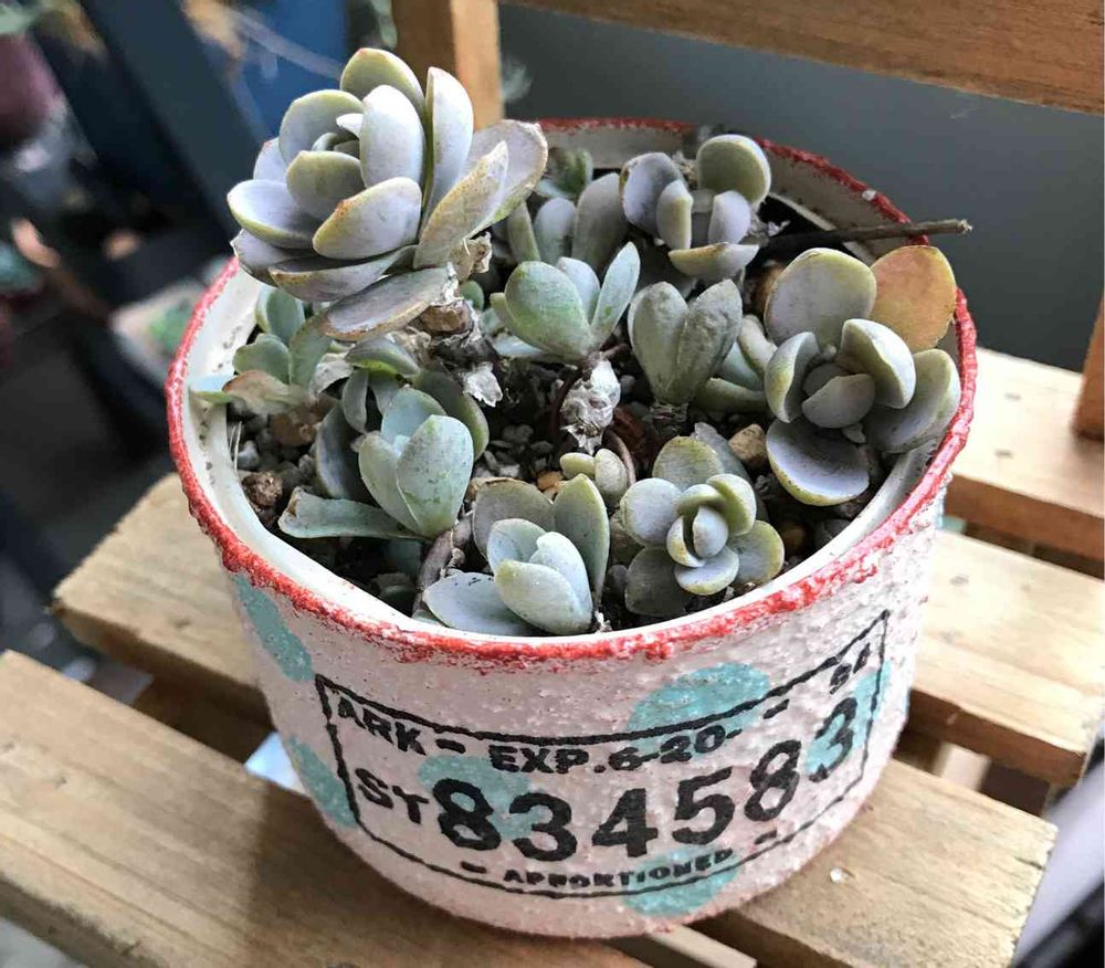 実家からお持ち帰りした子持ち蓮華を可愛いリメ缶に植え替えしました♪