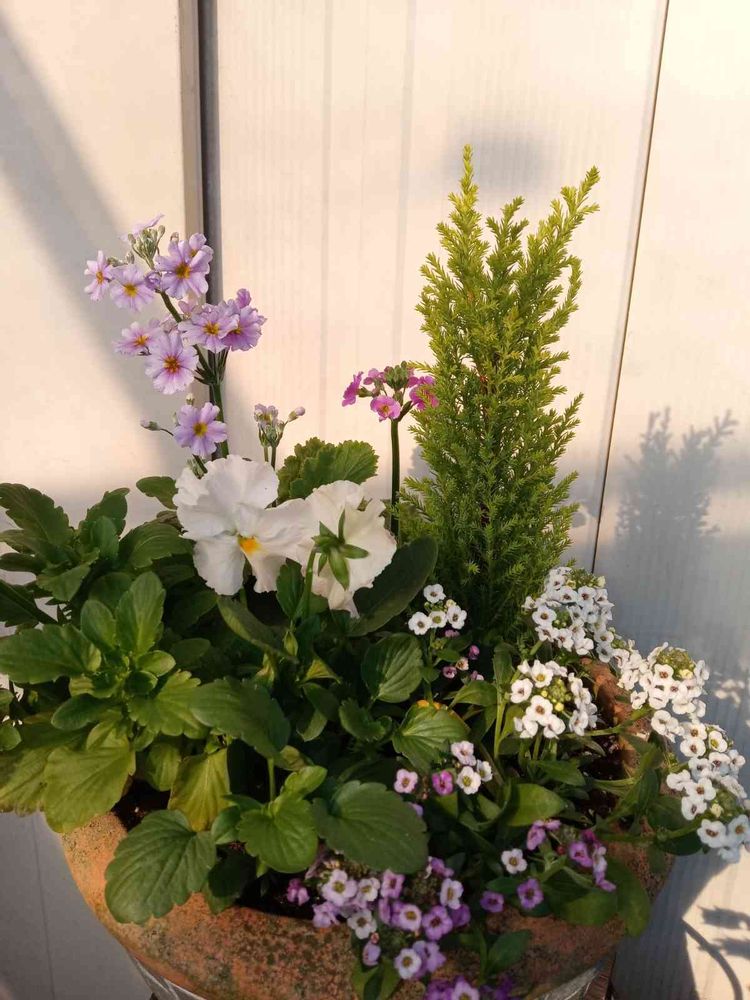 パンジーとサクラソウを買ってあとは庭にあるものだから、もっと垂れる花や背丈の高く揺れる花を入れたかったですね😅