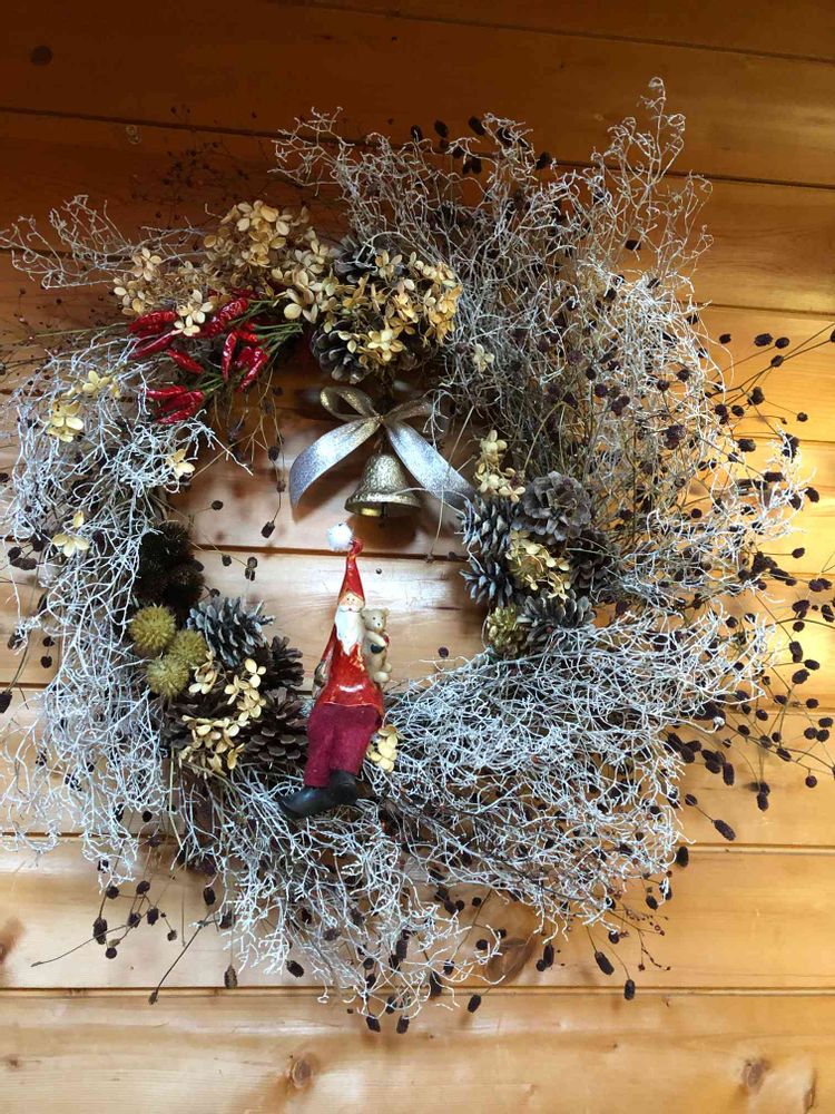10月6日にハロウィン🎃バージョンで吾亦紅リースを投稿したものに、春の寄せ植えから自然にドライになったプラチーナを挿し、主人が山から拾って来てくれた、松ぼっくりを添えたらそれらしくなったかな❓挿し色の赤。唐辛子🌶だけだとバランス悪いから、サンタ🎅さんにお願いしました。