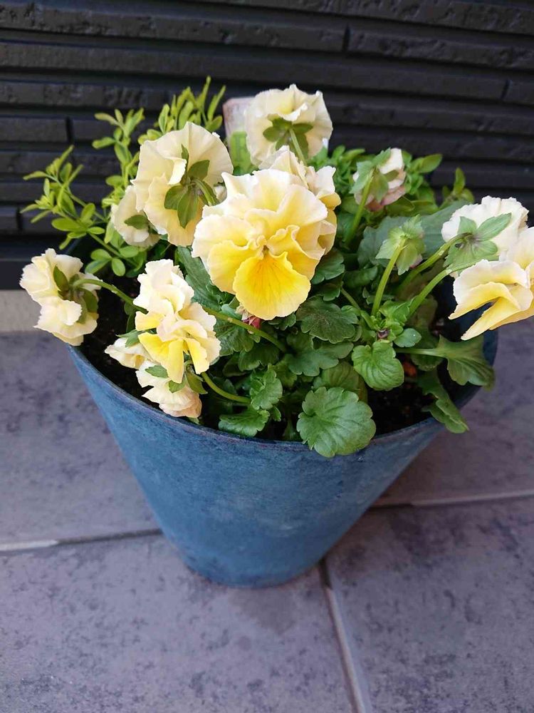 アンティークぽい色やピンクぽい色もありましたが、明るい黄色系を選んで、ネイビーの鉢と合わせました。