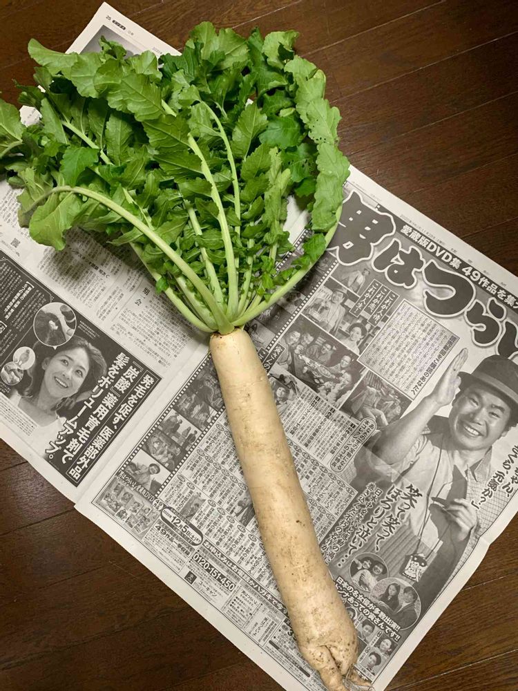 これまでで一番出来の良いダイコンが、勝手に生えたダイコンだったので、夫は少し凹んでて…💦たまたま広げた新聞には寅さんが…🐯あまりにピッタリだったので、そのまま採用しました😆