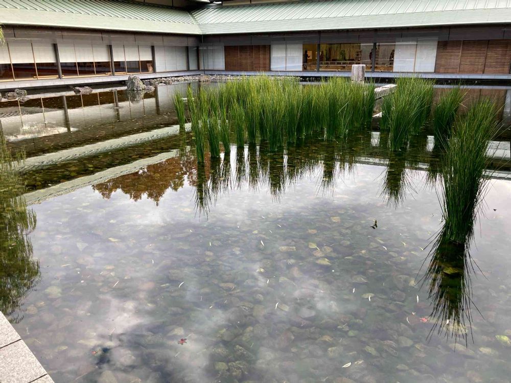 京都迎賓館の庭園池。青空と雲が水面に映り見事でした。