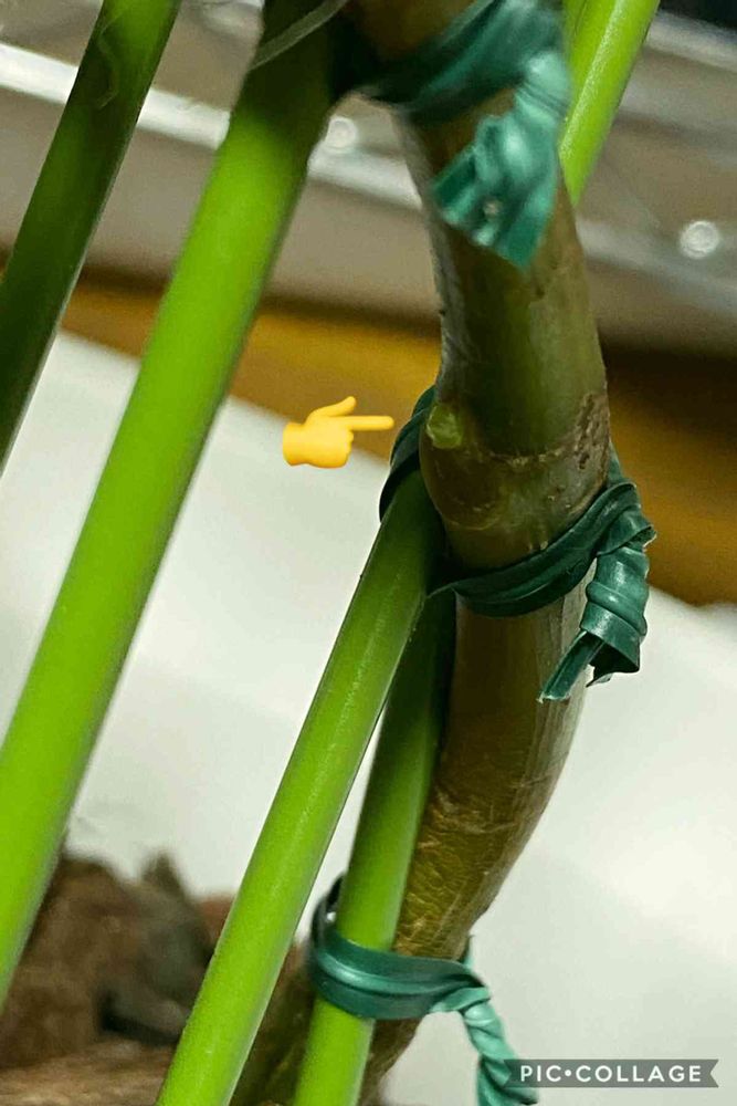 フィカス アルテシーマの曲げしてる時ふと茎見たら葉っぱがとれた所から新芽🌱が出てました😁凄くうれし〜😂